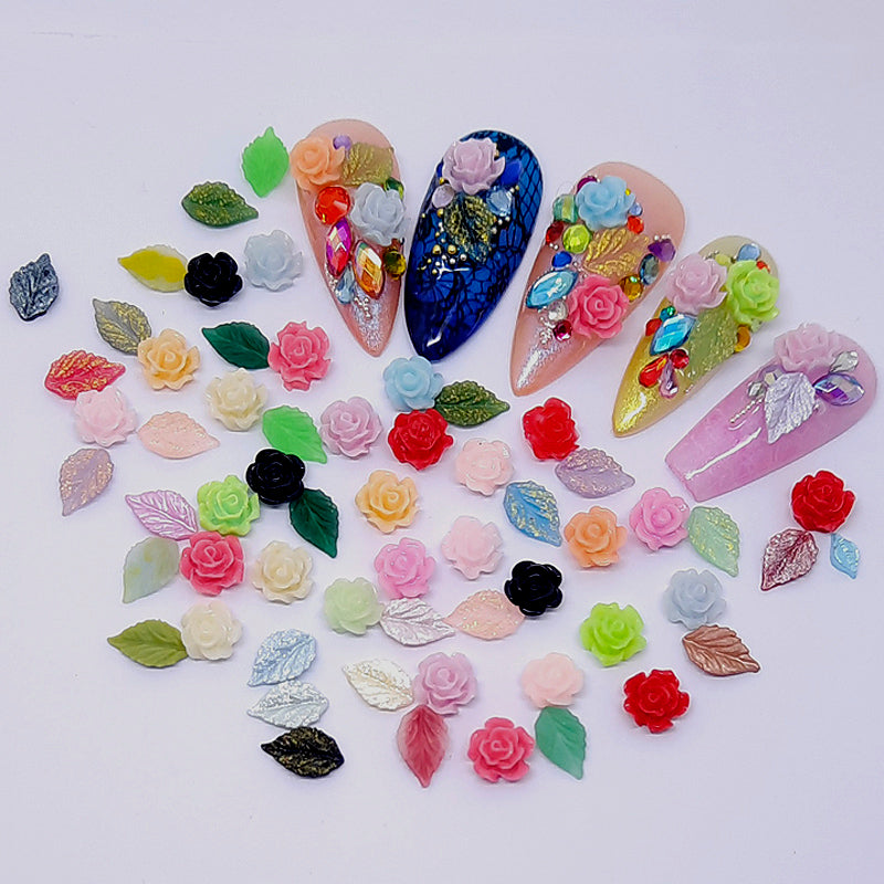 Rose Nail Charms & Leaves Set. 60 pieces in the set, 30 roses and 30 leaves in a mix of colours. These are so sweet and beautiful.