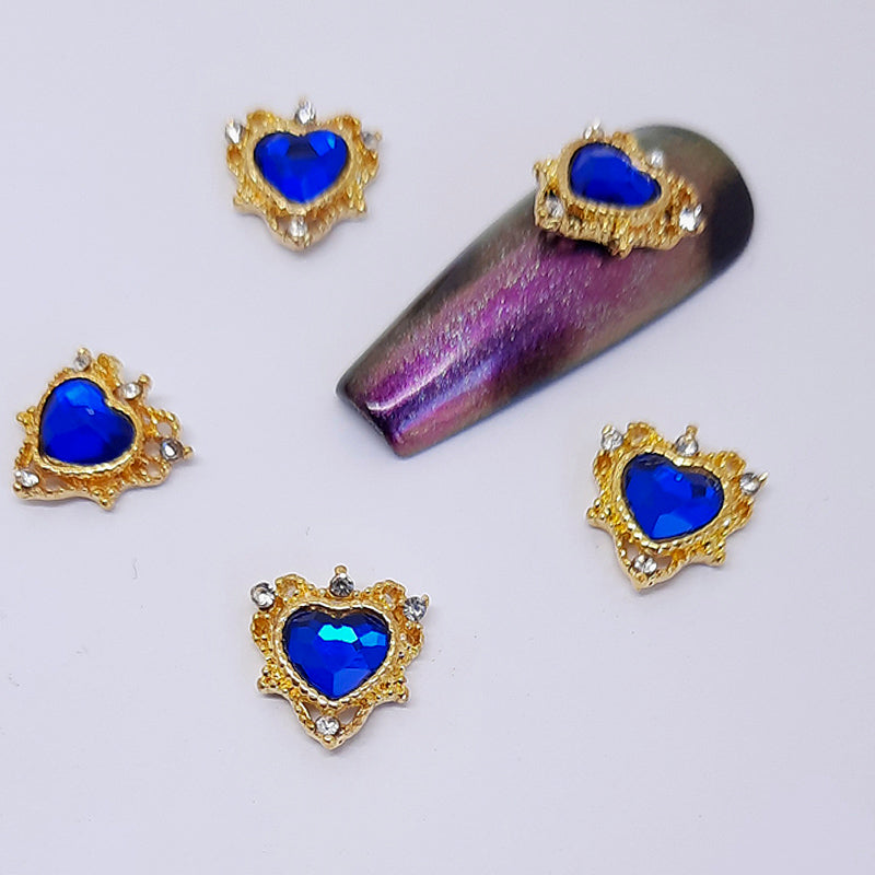 Ornate Heart Nail Charms, Blue. Beautiful ornate gold metal heart with a large dark blue crystal heart and smaller clear gems.