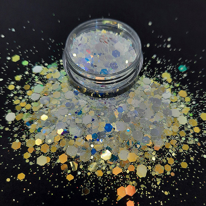 Pure Silver Iridescenct Nail Glitter 'Silver Dream'. A stunning pure bright silver nail glitter, mixed size hexagons in an iridescent sparkly powder.