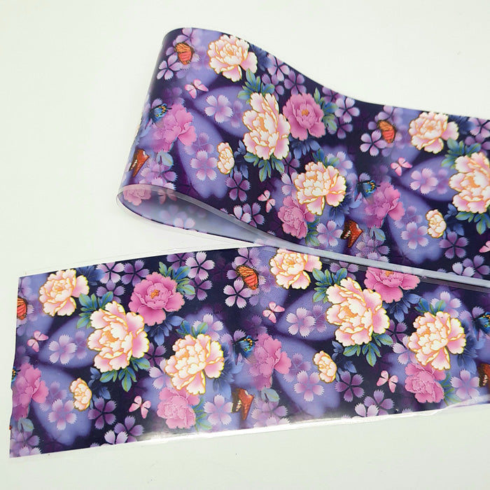 Sky Flowers Nail Foil #2. A beautiful floral nail foil, in dark blue with pink, lilac and white flowers with little butterflies.
