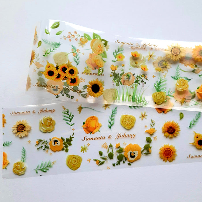 Sunflowers + Yellow Flowers Nail Foil, a beautiful mix of flowers and leaves on a clear backing.